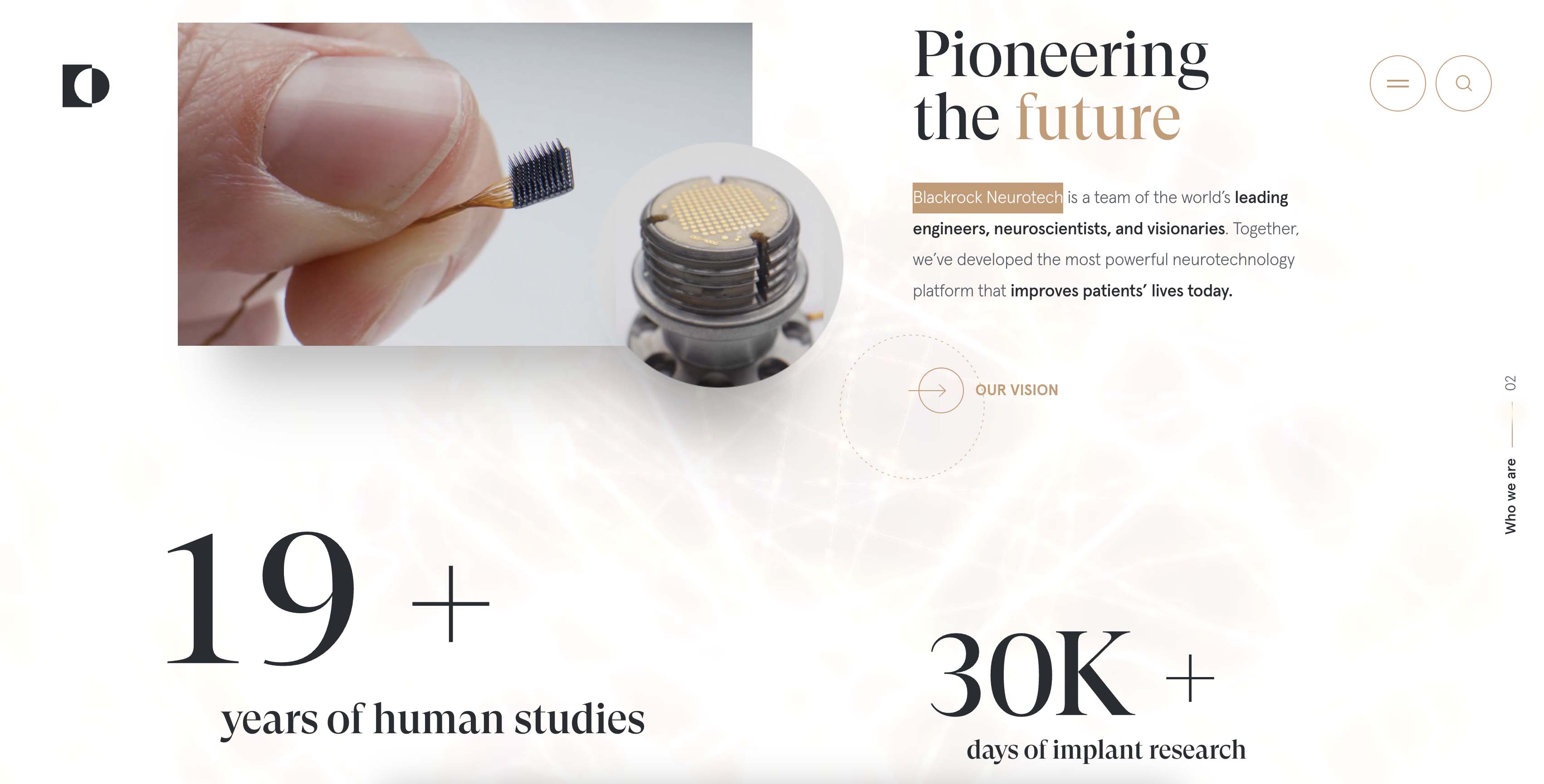 The website redesign emphasized Blackrock Neurotech's role as a pioneer in treating neurological diseases, dysfunctions, and paralysis disorders. The company sought a website to communicate its brand story while seeking funding to expand its product range, applications, and partnerships. The design needed to be impressive and accessible, particularly for users with special needs. The project’s creative demands added complexity, with each animation requiring 3,000 to 4,000 lines of JavaScript.