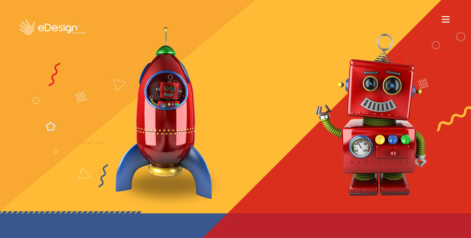 This style of web design includes a main color and the two colors one space away on each side of the color wheel (split-analogous color scheme). Below is a great example of how bright colors can be used to create a childlike atmosphere.
