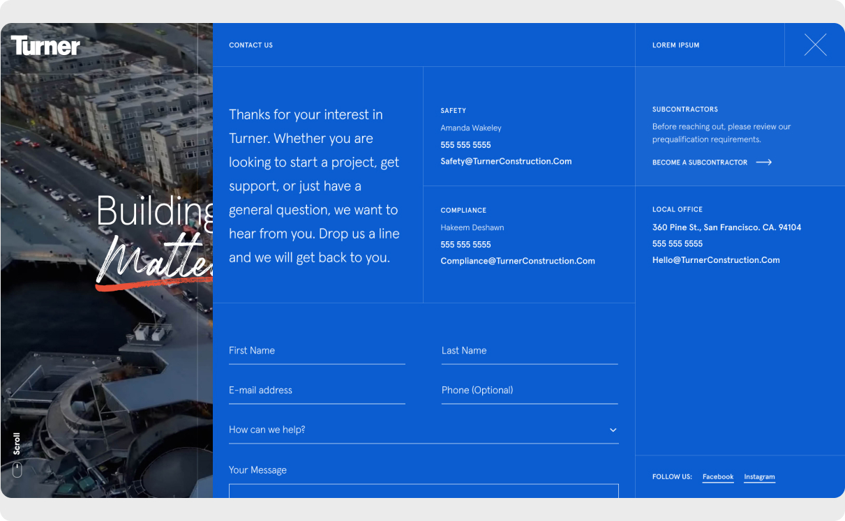 Turner operates many decentralized marketing teams spread across multiple regional offices. Our task was to design a website that allows for flexibility in showcasing local content while ensuring consistency across borders. Achieving a balance between customization and design standards required innovative thinking. Our aim was to empower local teams while upholding Turner's brand image and message. designifybrand introduced a "News and Insights" section, providing marketers with the ability to generate compelling content beyond conventional press releases. This new feature empowers Turner to easily share case studies, project photos, and success stories, thereby broadening their scope for content creation. Marketers were thrilled upon discovering the web space we designed specifically for them, offering a seamless avenue to craft and publish engaging stories.
